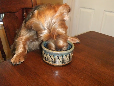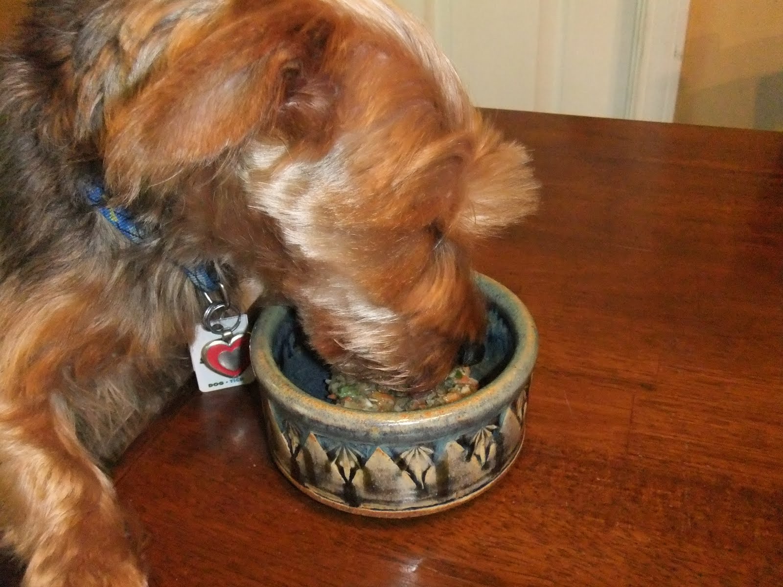 Kirby is a slow eater. He didn't raise his head from his bowl until he had licked it clean. In fact I couldn't get him to look up for a picture. It is on my standing order list.