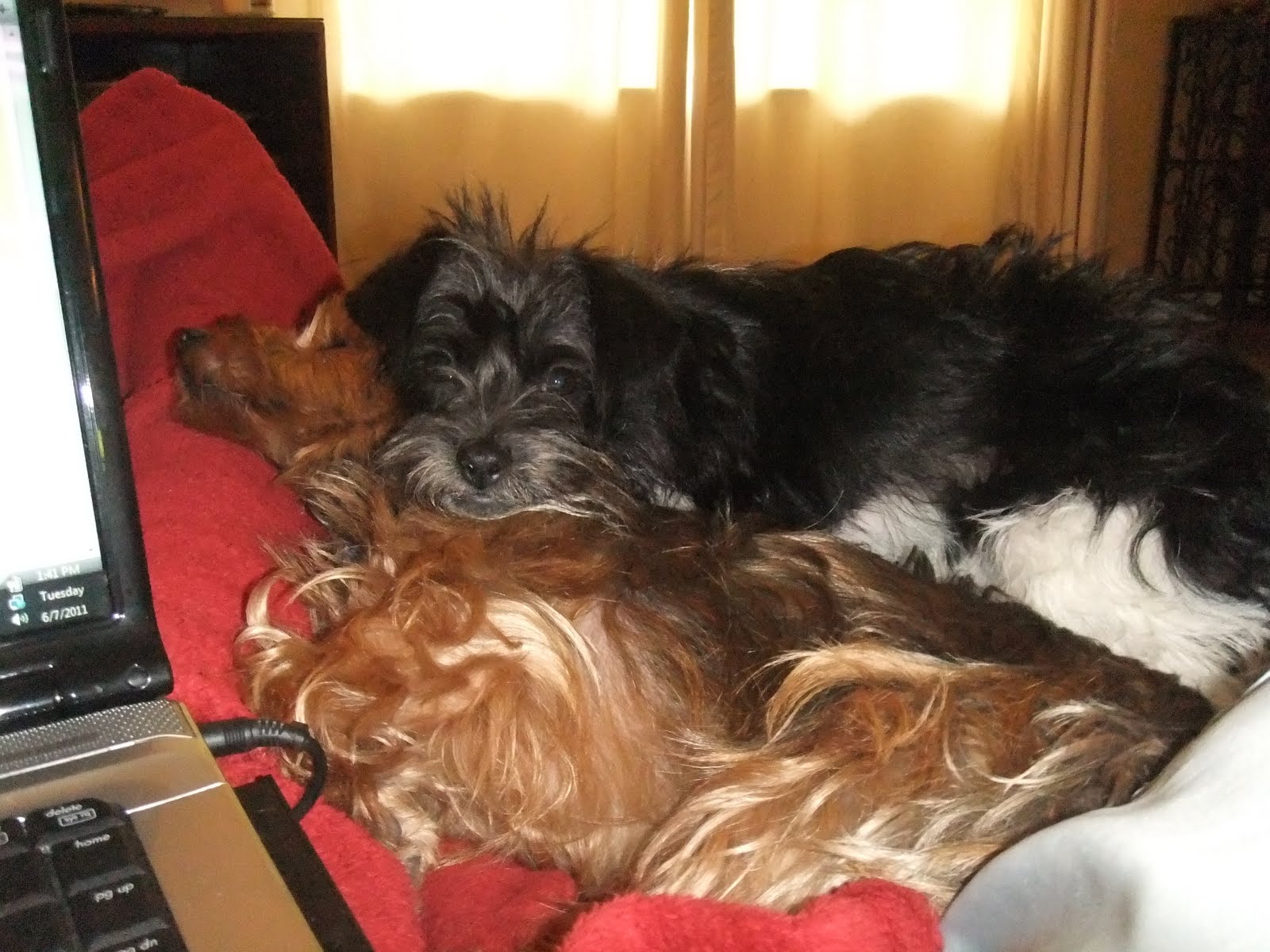 Trixie took to Kirby immediately preferring to stay near him and snuggling next to him to sleep. I'm pleased he took on the role of big brother quite easily. Kirby loves to be chased but Trixie, being faster, prefers to tackle him. They wrestle and play what I can best describe as "bitey mouth" nipping and pulling as they tumble over and around each other. Kirby is larger and heavier than her but seems to know he can hurt her which of course gives her the advantage of pinning him down. Little Trixie always wins which I suppose is probably good for building her confidence!