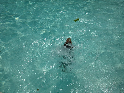 I did have one scare when a large beautiful brindle pitt went after Kirby's toy in the pool. She got to it about the same time Kirby did. As they collided she pushed him completely under the water with her paw. I did panic but Kirby quickly popped his head back up as he raced her to the edge of the pool. No harm done. Notice which one has the toy in their mouth.