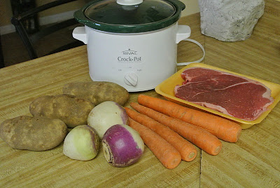Spray inside of slow cooker with olive oil non stick spray. Pour in the meat, potatoes, turnips, and carrots. Add the olive oil. Pour undrained crushed tomatoes over top. Cover and cook on low for 8 to 10 hours or on high for 4 to 5 hours or until meat is tender. Stir once in a while. Let cool and serve.
