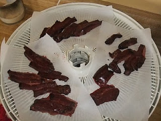 When we were finished I still had some calf liver left. I've made fish jerky (Kirbs loves Tilapia) and chicken jerky, so why not liver jerky? Liver can be rather runny so first I baked it in the oven at a low temperature to firm it up. Then into the dehydrator for the night.
