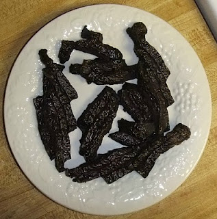 They were just right by morning. I turned off the dehydrator and headed to work. That evening I took them out and, with Kirby begging please, please, please, gave him a small piece. Then I plated them and took a picture. After Kirby had eaten his supper I gave him another piece. Soon I was busy with our normal nightly routine. A couple hours later I went into the kitchen intent on giving Kirby one more piece and refrigerating the rest. What rest? Much to Kirby's dismay, one of our cats, Chelsea very much likes liver! The plate was completely empty. Not even a morsel for Kirby to savor.