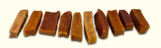 It's is a very hard cheese from an ancient recipe using only four ingredients: yak milk, cow milk, salt, and lime. This chew was originally created to provide a long-lasting snack the locals can slowly work in their mouths while they are working in the fields. Dogs work the end of the treat for hours softening it with their mouths before small parts of it can be slowly scraped off. I found the process fascinating which you can read here.