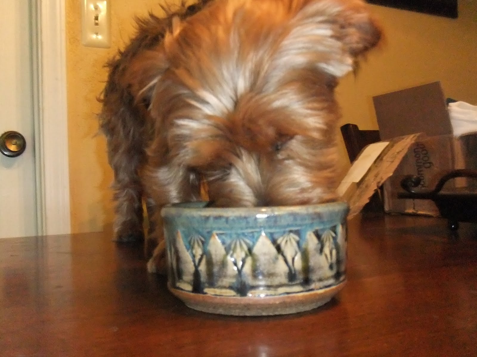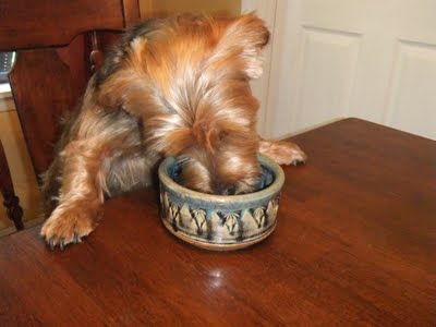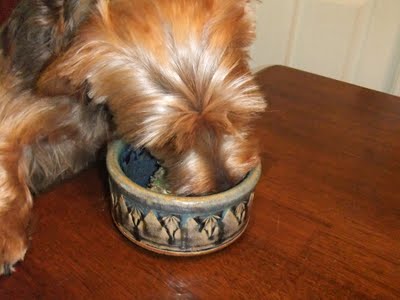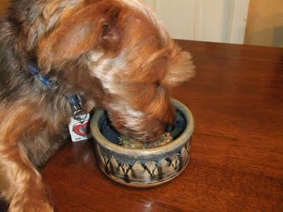 /I do bake and cook a lot for Kirby but he doesn't eat as much as you would think. If I let him free feed he would be one fat boy considering how much he loves food. I like to know how much he is eating and if he isn't eating which is a sign something is wrong so I believe in portion control. The meals I cook for him are frozen in individual sizes for future feedings while the treats are shared with other dogs, especially the ones that come through the drive thru at the bank where I work.