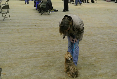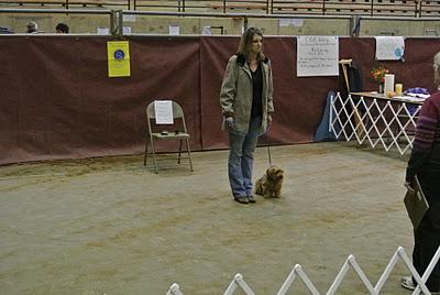 Our classes alternate between obedience trainingand rally training. A funny incidenthappened one night at class not too long ago. All the dogs were waiting in the down position at one end of the room witheach of us standing directly across the room from them. Two dogs next to Kirby got into a ruckus growling at each other. Kirby was frightened but staying in the downposition, he began crawling across the floor toward me as quickly aspossible. I met him halfway scooping upa very relieved pup!