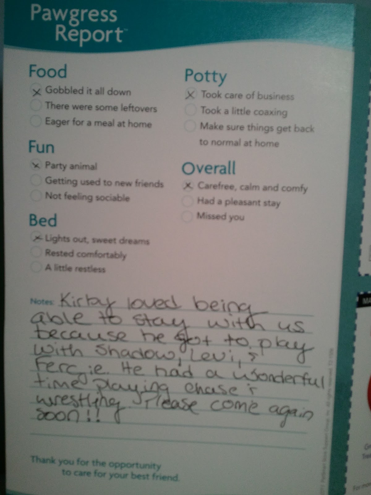 Each pet’s daily activities are continuously monitored on activity sheets providing a detailed record of your pet’s stay. You’ll take home a Pawgress Report showing details such as how your pet ate, played, and slept. I was very pleased with Kirby’s Pawgress Report Card!